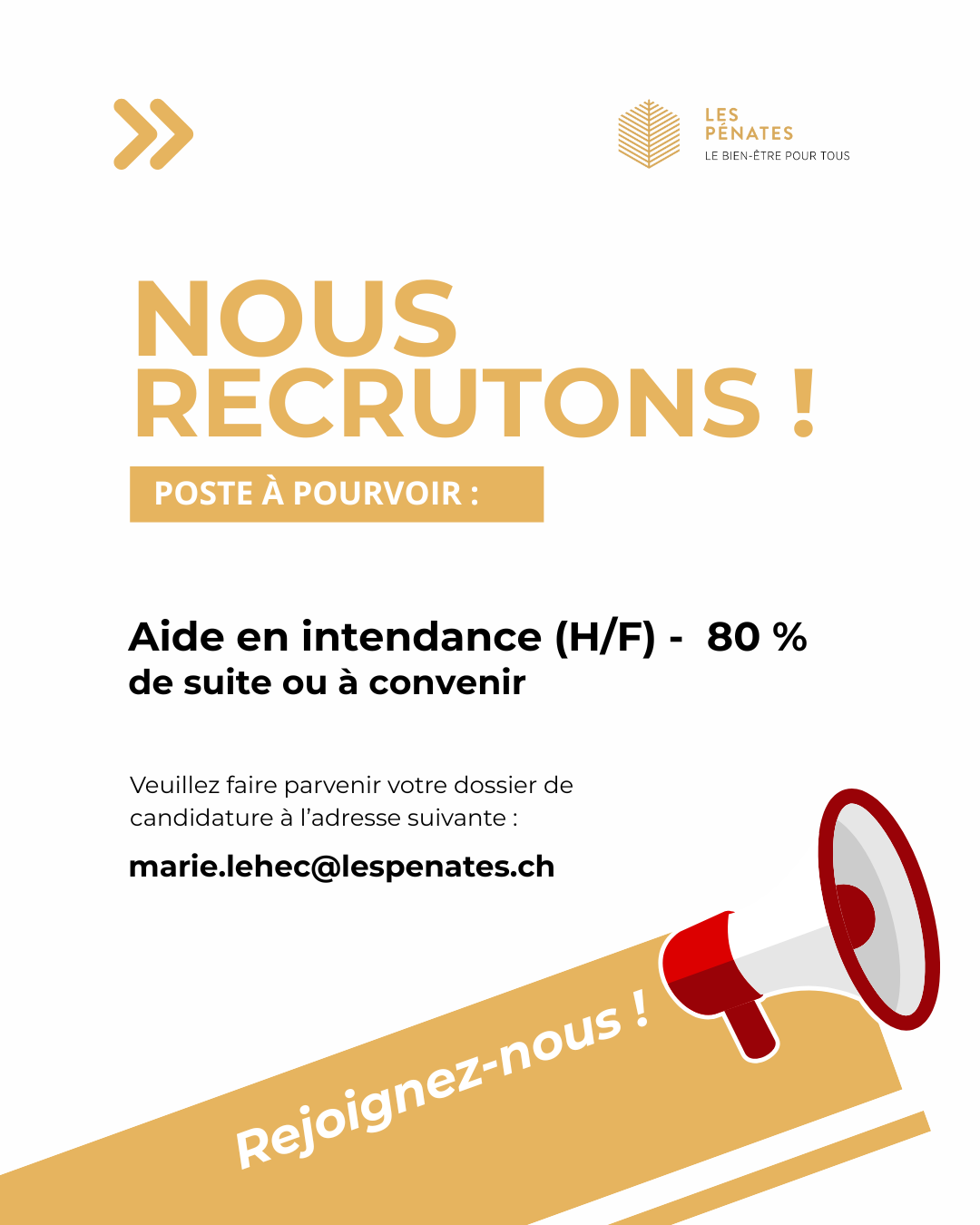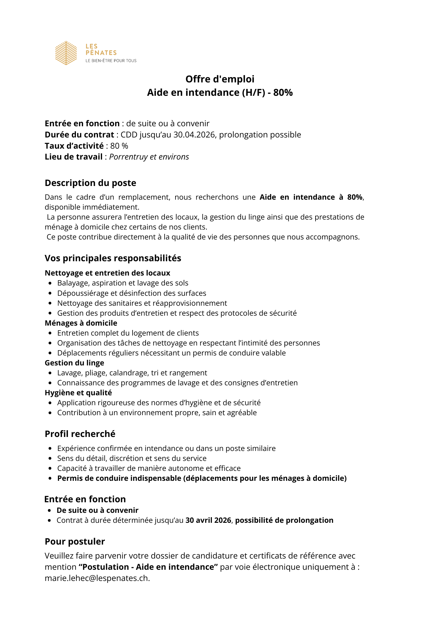 Pour postuler au sein d'une entreprise du groupe, nous vous prions d'envoyer votre dossier complet à l'adresse : postulation@lespenates.ch en mentionnant "Candidature spontanée".